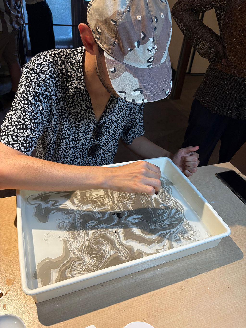 墨流しは、墨を使った日本古来のマーブリングです。1200年前に京都に住む貴族が水の流れを楽しんだことから始まったと言われています。暑い日が続きますが、ぜひ優雅な涼を体験してみてくださいね。